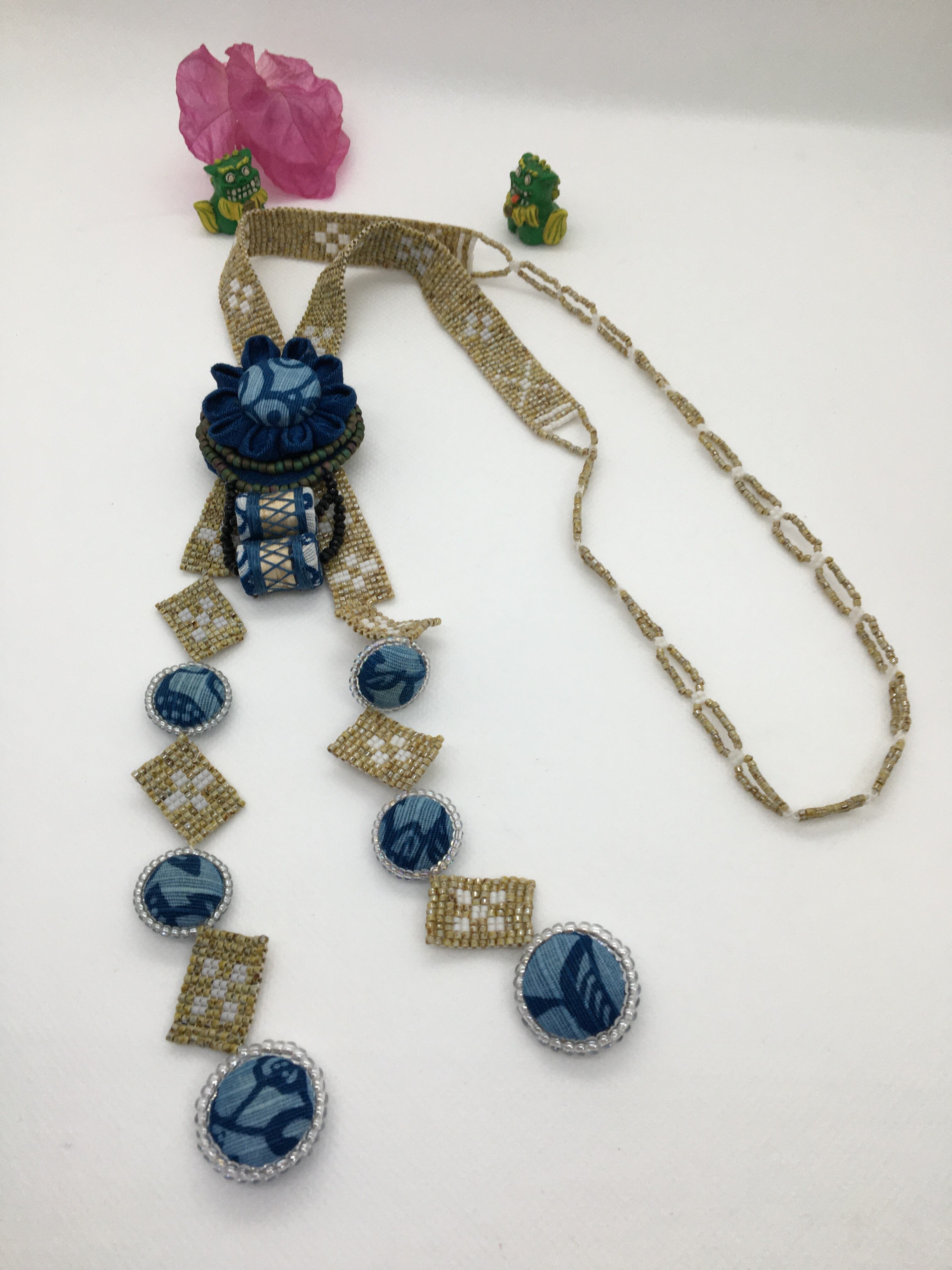 しあわせ運ぶミンサー模様のモチーフと紅型(藍型)の和のパーツをつなぎ合わせ個性的なオシャレを楽しみたい貴女のために一つ一つ想いを込めて制作しました。