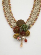 ネックレス部分をヘリンボーンステッチ フラットの技法で編み、中央部分には首里織のくるみパーツとビーズボールやカーネリアン等で上質感を演出しアクセントにしました。